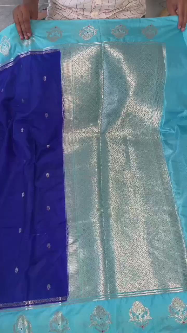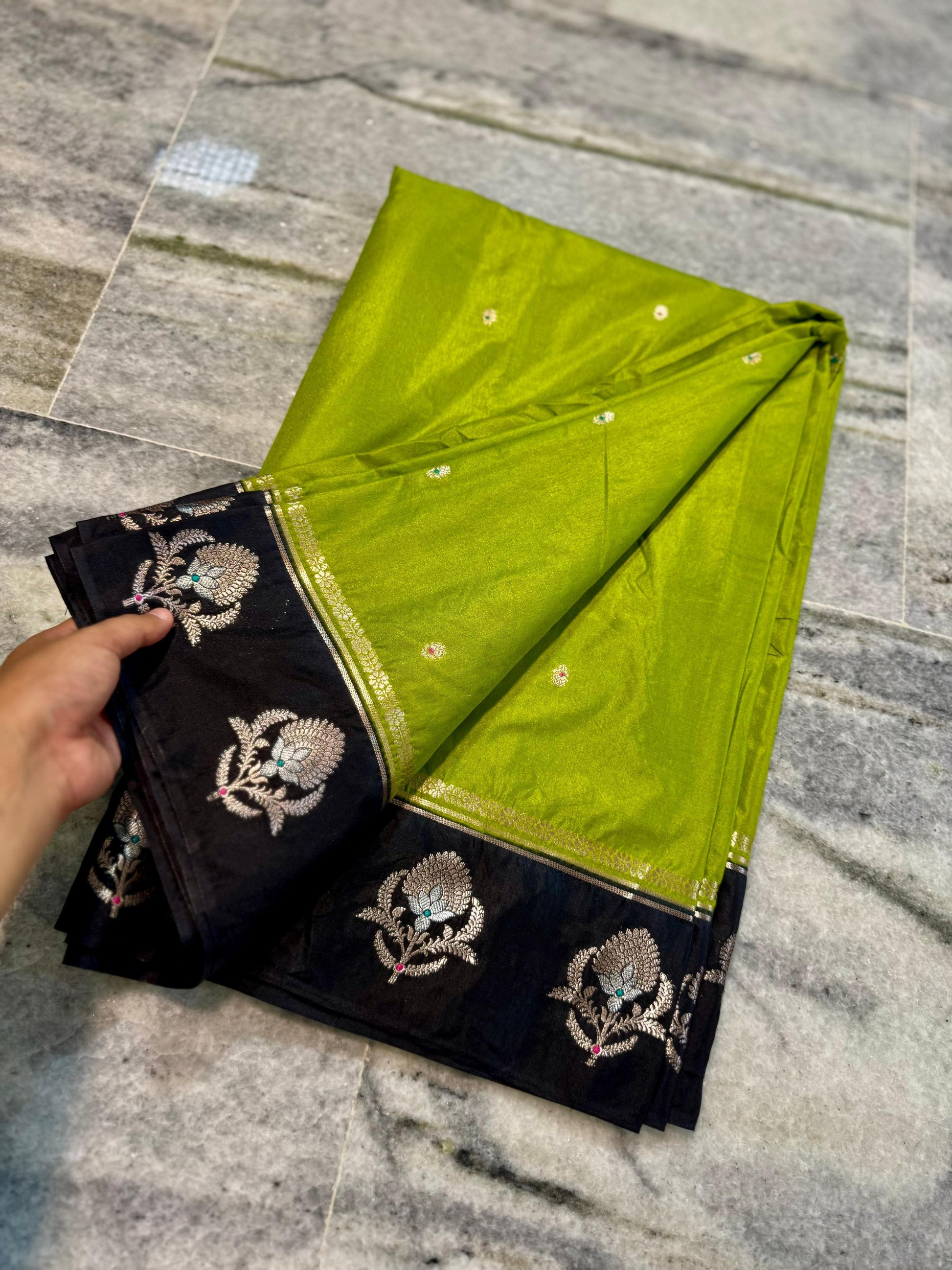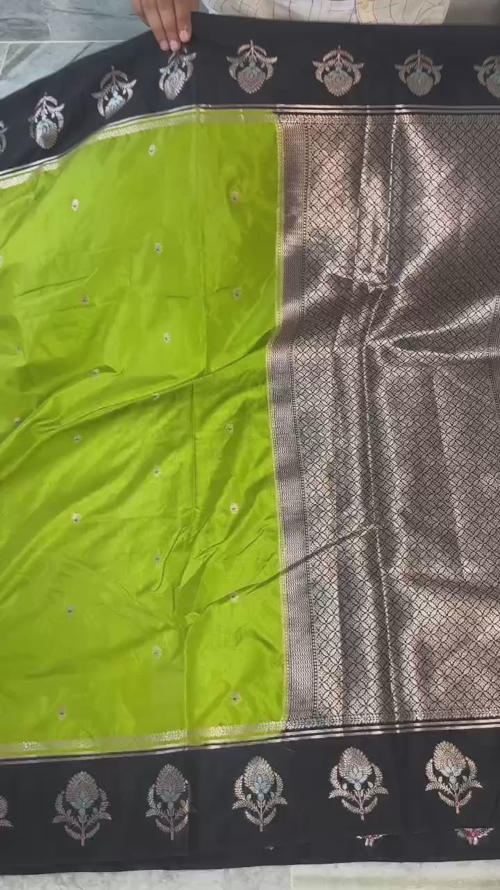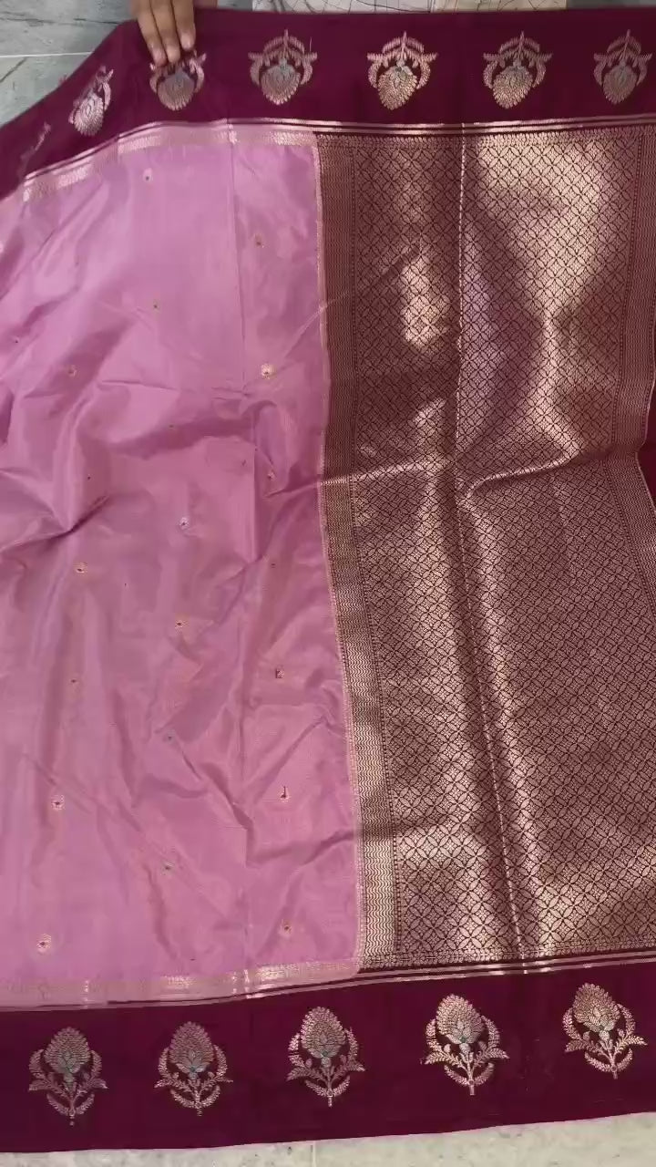 - Border: Banarasi zari weaving with big Alfi Mina floral pattern