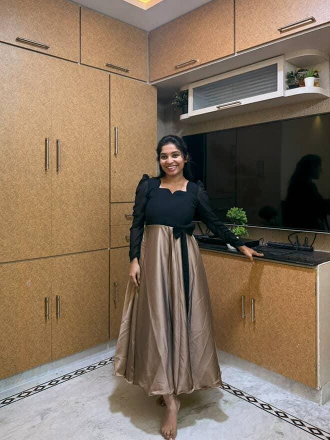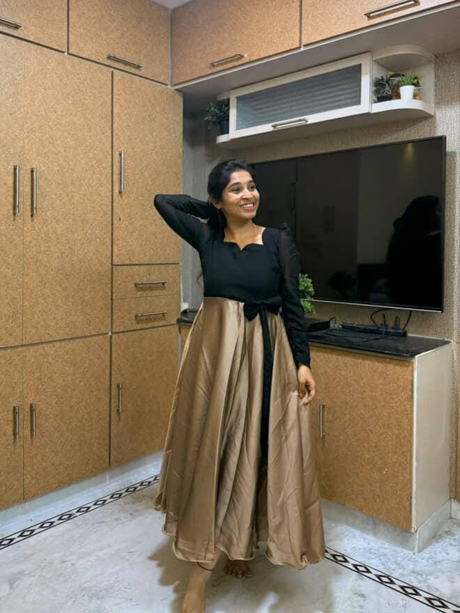 - Elegant black and gold satin long dress designed for both casual and festive occasions. Features a black fitted top with long sleeves, stylish neckline, and a flowy golden satin skirt. The waist tie adds a flattering touch for a perfect fit.