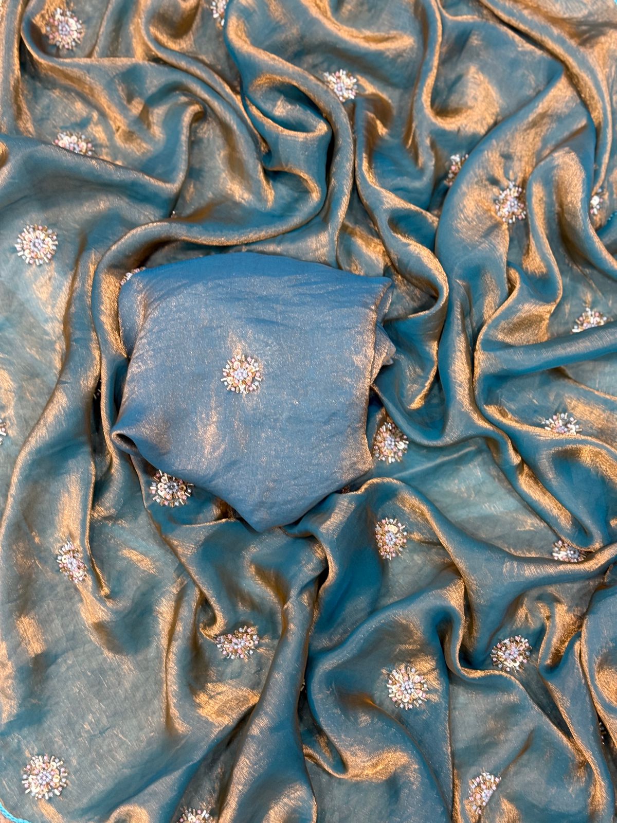 - Blouse Work: Designer Brits Hand Work with Sequence Detailing and Aari Work Borders