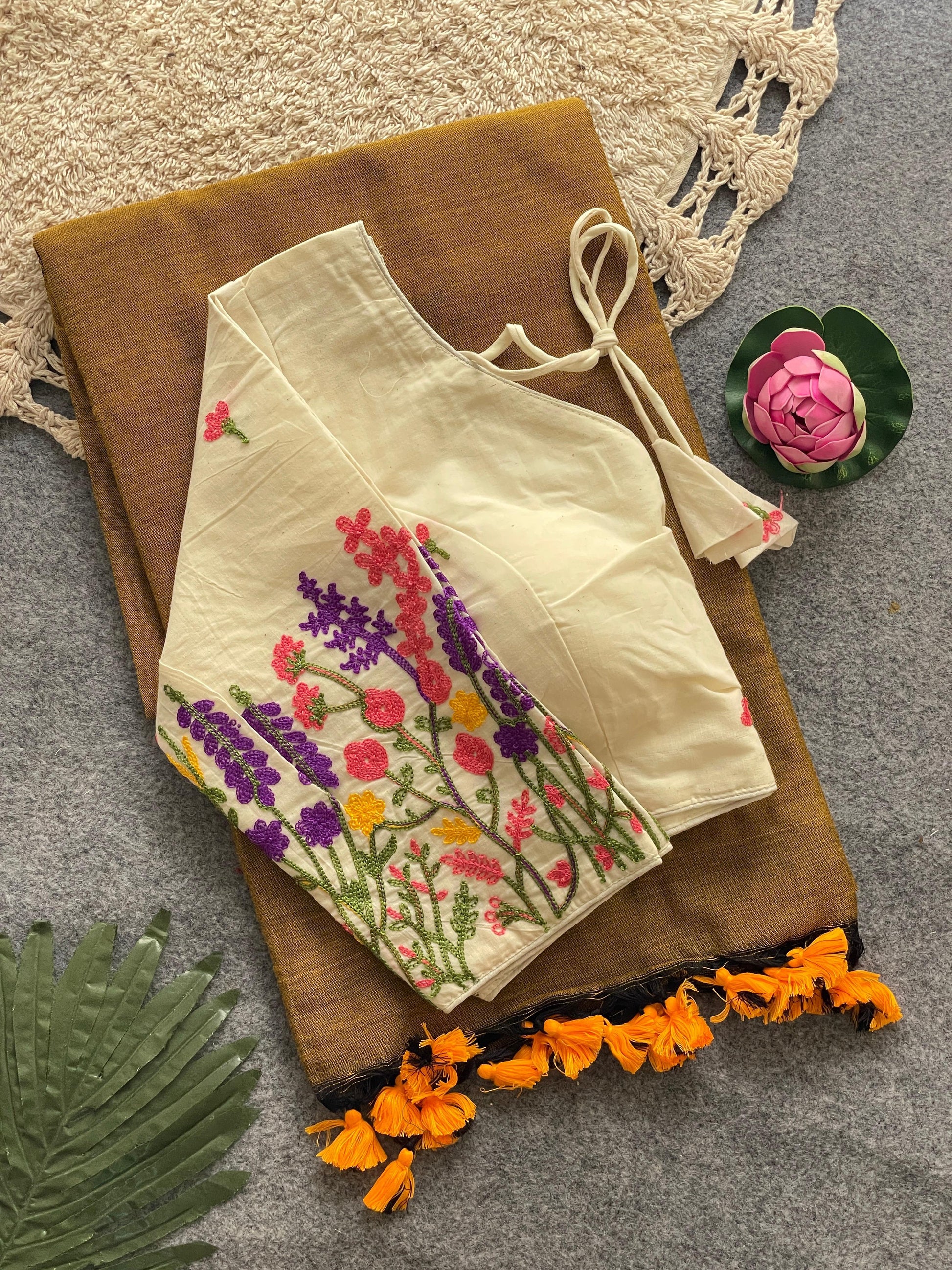 Blouse:-Pure Khadi Cotton with heavy embroidery work and Padded blouse with pure cotton lining