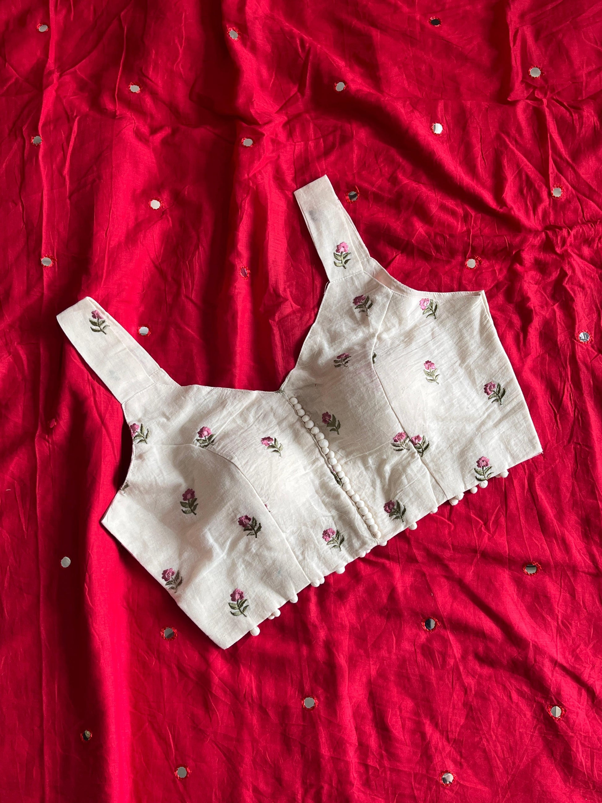 Paired with a pure Khadi stitched sleeveless blouse piece (Free Size), beautifully detailed with embroidery work as shown.