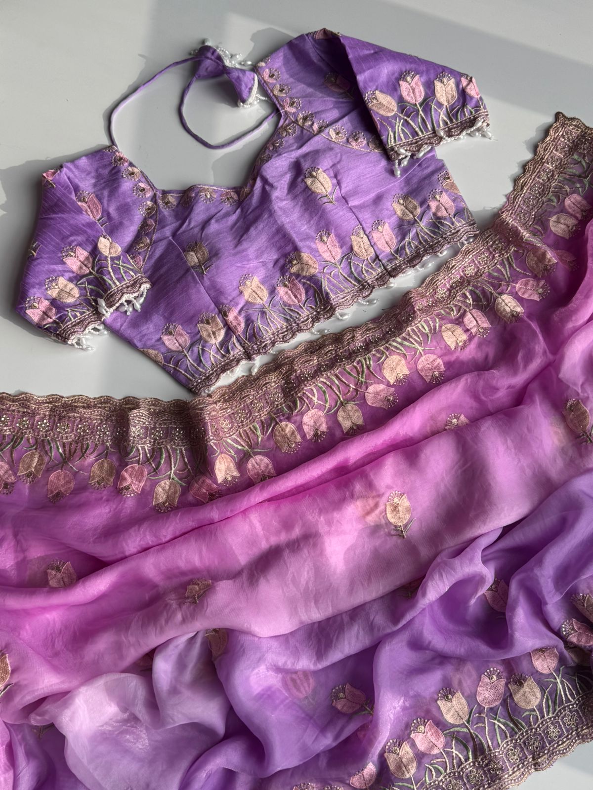 - All-over saree adorned with fine buttis and subtle Aarco design
