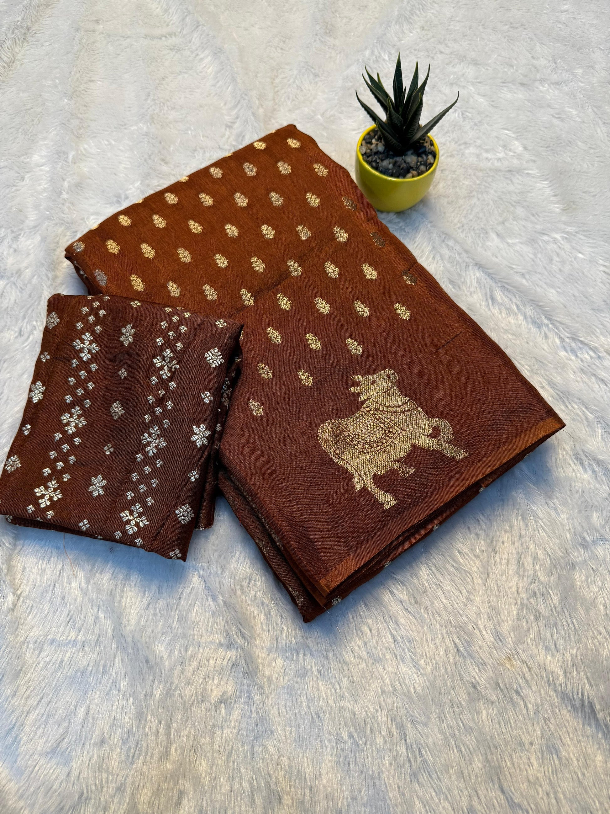 - Design: Chit pallu with elegant cow zari border pattern