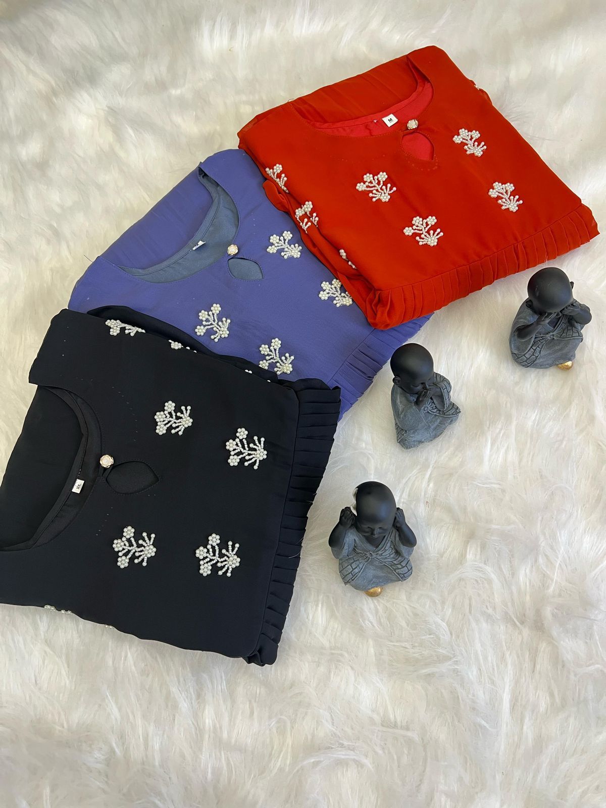 Premium Blooming Georgette with intricate handwork (Khatli - Maggam Work) on the neckline and designer sleeves.